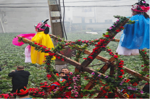 在与方主任的交流过程中我们了解到,露台这门独特的民间艺术,已濒临失传,露台表演队伍日趋减少。目前,唯有富山、瑶山两地有此项活动,其他地方均已绝迹。艺术人才流失,尤其是露台道具的制作艺人和露台表演艺人,后继乏人。近几年,国家和省里都加大了非遗保护传承力度,富山村也在积极的推进非遗的保护和传承工作,村里一些年轻人也开始意识到文化保护的重要性,积极参与到露台秋千的保护和传承工作中来。这为秋千露台的传承注入了新的活力和希望。