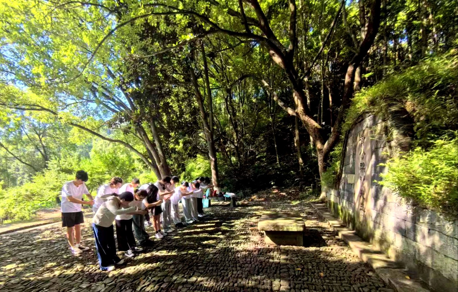 进园的第一件事,寻找梨洲先生的素墓,缅怀先贤。黄宗羲的墓冢庄严肃穆,台基前的神道两侧各有一口荷花池;周围一带三面丛山巍巍,绿荫蔽日,仿佛在为这位伟大的思想家默默守护;墓冢正面用条石错垒,形似观音兜,中间竖石刻墓碑,上书“黄公梨洲先生墓”七大字。同学们神情庄重,于先生墓前以最虔诚的心向梨洲先生三鞠躬致敬。孔子曰:“君子有三畏:畏天命,畏大人,畏圣人之言。小人不知天命而不畏也,狎大人,侮圣人之言。”那一刻,仿佛历史与现实交织在一起。孔子之言,于梨洲先生墓前回响。只有心怀敬畏,才能做到循礼、守义、遵道,才能做到谨言慎行,对自己有所要求,对人对事都尽心尽力。此时此刻此地,追思先贤、继承传统、走向未来,文化的传承得到最生动的体现。