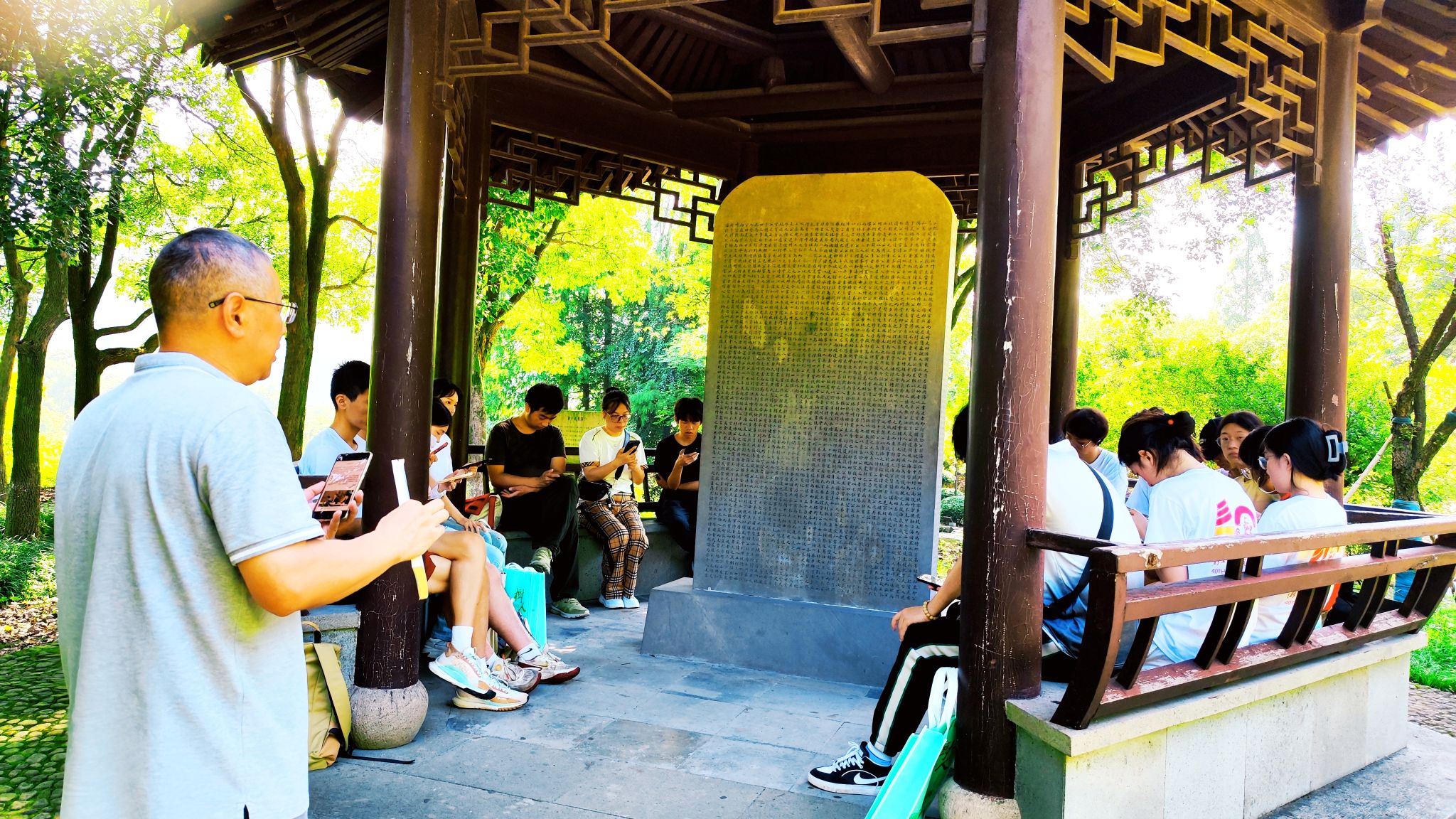 接下来,我们在黄宗羲神道碑亭,首先朗读《原君》的片段,以我们的方式向先贤致敬。然后余永林教授引领尚友书社同学,围绕先生著作《明夷待访录》进行相关的阅读心得分享。不同于以往,余教授先从明夷卦象切入,并引用商周时期箕子的经历,向同学们解读黄宗羲先生“古者天下为主,君为客;今也君为主,天下为客”之言,由此引出其对当时社会政治状况的深刻洞察和批判以及对于民主、平等、法治等现代理念的追求,并结合生活实际引导同学们:即使处于困境之中也应坚守正道,勇于改革创新,为实现更加美好的社会而努力奋斗。