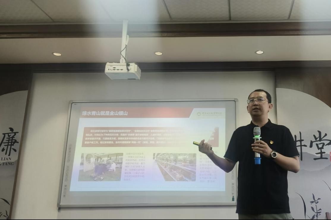 赵老师结合“习近平新时代中国特色社会主义思想概论”教材,参照“第十二章 建设社会主义生态文明”章节中的“绿水青山就是金山银山”内容,带领同学们领悟了生态共富是乡村振兴与生态文明转型的统一过程。他简要阐述了生态文明和“两山”理念的内涵,借助安吉余村转型发展的案例,重点分析了棠棣村如何从一个兰花种植历史悠久的普通村落成为全国首个以兰花为主导产业的乡村振兴示范村的过程,成功揭示了二十年来棠棣村实现村美民富的绿色密码。