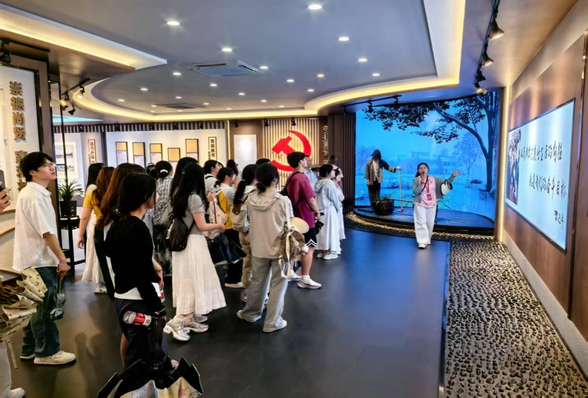 主题微课后,师生们沿着“乡村振兴实训基地——棠棣村乡史馆——参观兰花数字园——兰花文化长廊”的路线开启实践研学之旅。在布局合理、主题鲜明、功能现代的棠棣村村史馆,师生了解到棠棣村养兰历史可追溯至明代,清代“滴清兰布”名扬江南,村内的中国春兰样品园更是全球最大春兰基因库。“屈原佩兰明志、勾践植兰砺心,兰花的‘君子之风’不仅是文化符号,更凝聚着乡村振兴的精神内核。”讲解员的生动讲述,令同学们深感中华文化的底蕴深厚。