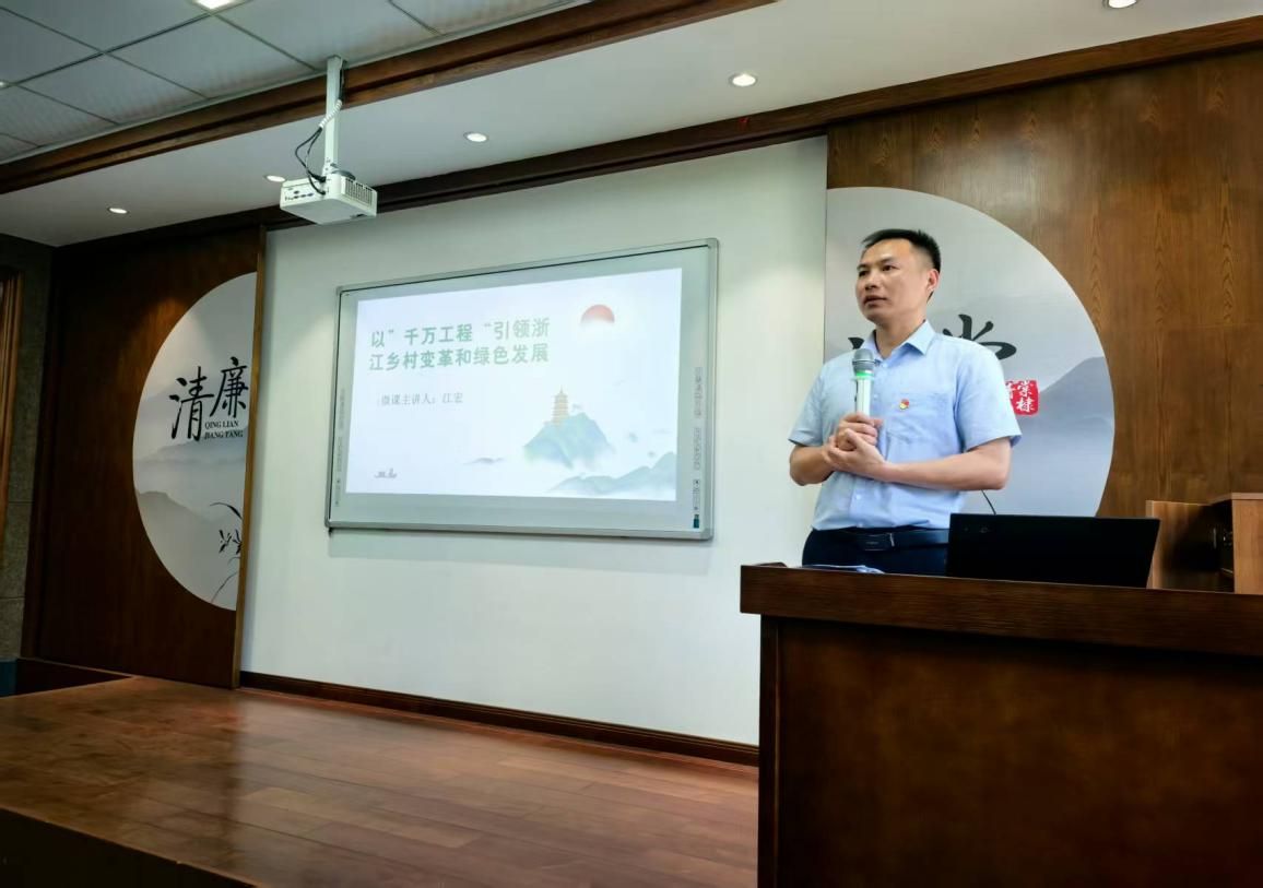 思政微课教学环节,江老师围绕“习近平新时代中国特色社会主义思想概论”教材“第六章 推动高质量发展”部分的内容,以“‘以千万工程’引领浙江乡村变革和绿色发展”为题,系统介绍了浙江“千万工程”的由来、实施过程、主要内容及重大成就。他总结到,浙江“千万工程”取得的重大成就,是习近平生态文明思想的重要实践成果,是浙江全省上下同心协力、共同努力的结果。浙江“千万工程”为绘就新时代乡村振兴画卷、建设美丽中国和引领全球生态文明建设,提供了宝贵经验,影响极为深远。
