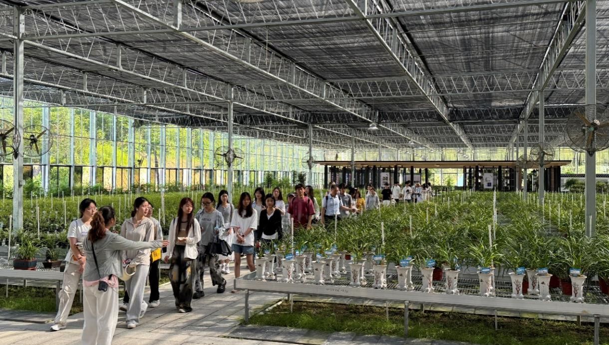 在4600平方米的兰花数字工厂,智能化场景颠覆了传统农业认知。恒温恒湿控制系统、自适应光照设备、透气性基质栽培技术……科技手段让兰花突破自然限制,实现全年高效培育。英语231班易盼同学惊叹:“通过物联网实时监测,手机就能调控生长环境,农业原来可以这么‘潮’!”讲解员还介绍,棠棣村依托“兰花数字产业村”优势,2024年村民人均收入超12万元,科技真正让“美丽资源”转化为了“美丽经济”。
