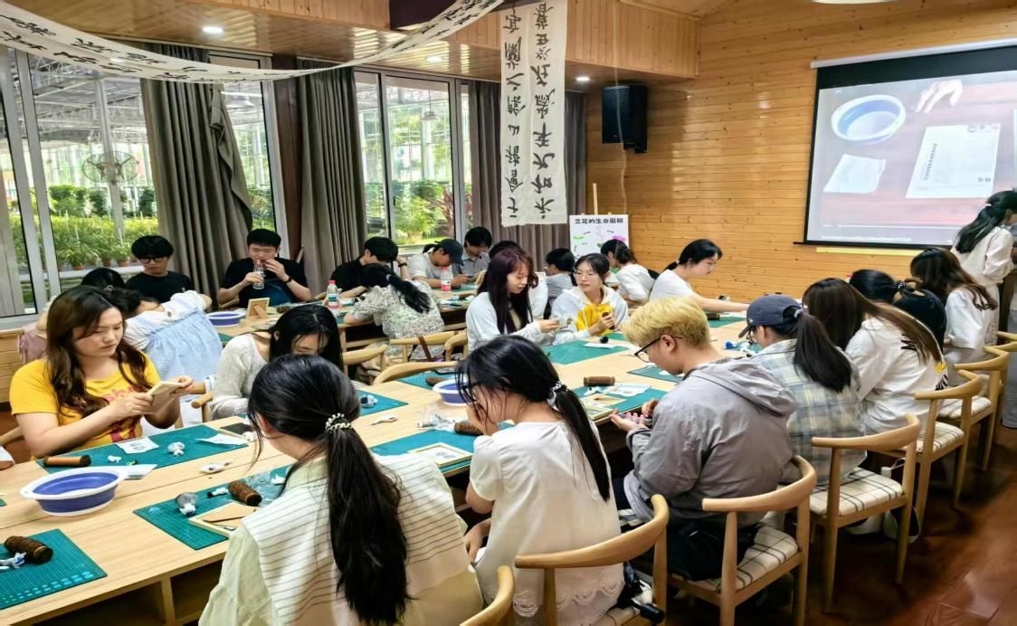 最后,员工们在基地老师的带领下参与兰花钱币的拓印、种植养护讲解等实践环节,一方面近身鉴赏兰花文化艺术的精美,另一方面沉浸式体验非遗手工制作的乐趣。同学们认真聆听讲解,细心研磨拓印,生动诠释了“工匠精神”的传承魅力。在乡村振兴讲习所,与农户面对面交流,进一步了解棠棣村如何从普通山村蜕变为“全国生态文化村”。“95%村民从事花木产业,形成‘种植+电商+文旅’全链条,这种‘一村一品’‘一村一业’模式对我们专业学习很有启发。”工艺美术231班曹雨璇同学在实践笔记中写道。