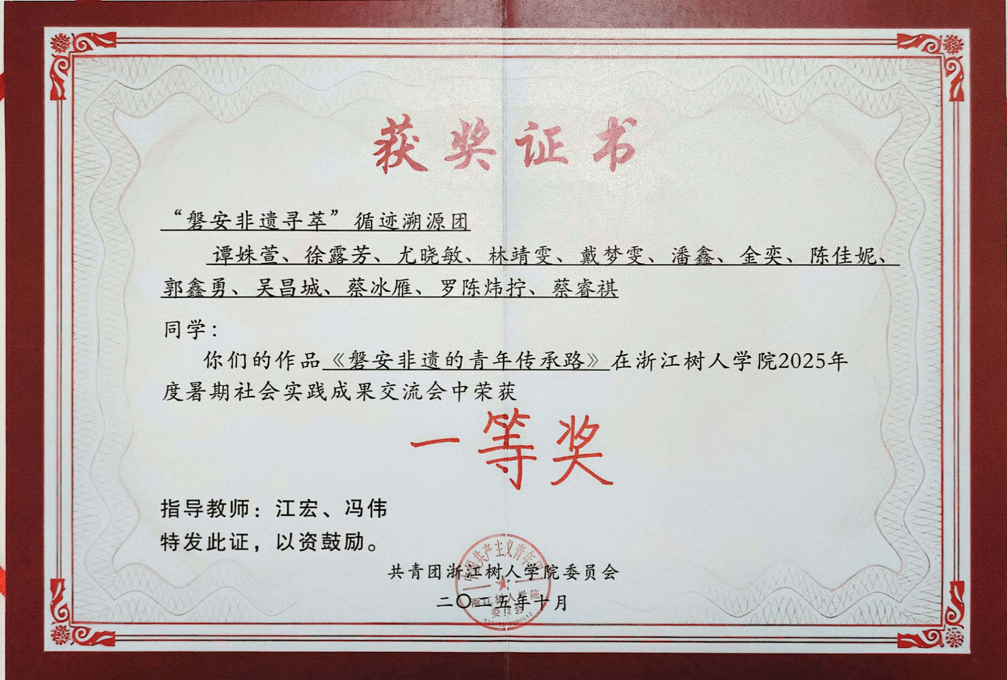 10月14日,永利集团官网“品尝真理的味道”2025年度暑期社会实践成果交流会在杨汛桥校区礼堂顺利举办。公司江宏、冯伟老师指导的团队以《磐安非遗的青年传承路》呈现了“非遗+文旅”创新模式,获得本次活动一等奖。