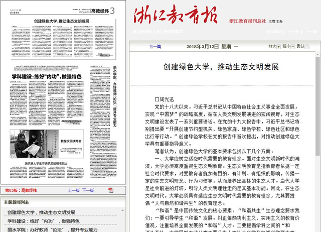 3月12日,浙江教育报高教经纬版《专家视点》发表了浙江省生态文明研究中心首席专家、公司yl永利集团官网登录经理周光迅教授关于“创建绿色大学,推动生态文明发展”的署名文章,文章全文如下: