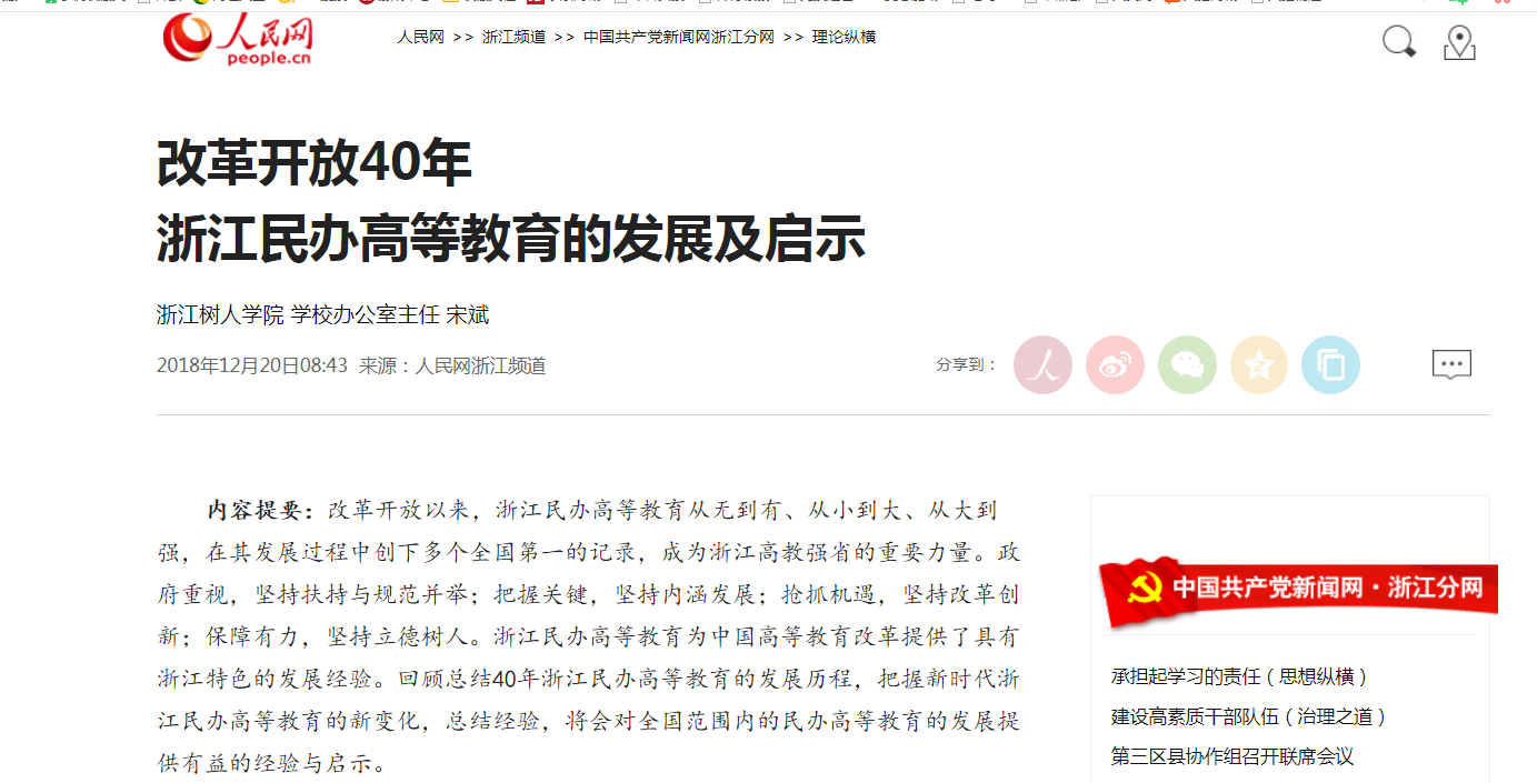 马克思主义理论学科带头人宋斌教授在人民网发表文章----改革开放40年 浙江民办高等教育的发展及启示