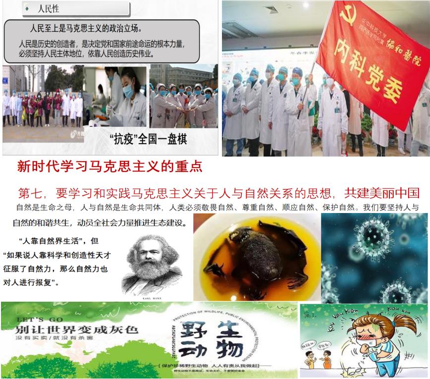 马克思主义基本原理概论教研室以“引导员工用马克思主义的立场、观点、方法科学看待疫情,树立以人民为中心,人与自然和谐共生的发展思想”为教育主题方向,在网络教学活动中积极回应员工社会关切,用马克思主义理论引导当代老员工科学看待当前的疫情。有老师从经典马克思主义学说视角切入,以当代“最美逆行者”中的90后、00后青年为例,带领同学重温马克思的《青年在选择职业时的考虑》,激发当代青年对自身使命的思考。有老师从人民立场出发,讲述疫情中的共产党员如何用生命践行不朽的宣言。有老师从学术视角出发,反思资本主义时代人类活动对生态破坏所造成的一系列后果,指出恩格斯早就告诫我们:“不应过分陶醉于我们人类对自然界的胜利。对于每一次这样的胜利,自然界都对我们进行报复。”自然是生命之母,人与自然是生命共同体,人类必须敬畏自然、尊重自然、顺应自然、保护自然。作为当代老员工,学习和实践马克思主义关于人与自然关系的思想,就是在日常生活中保护环境、爱护生物,共建美丽中国。
