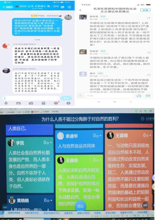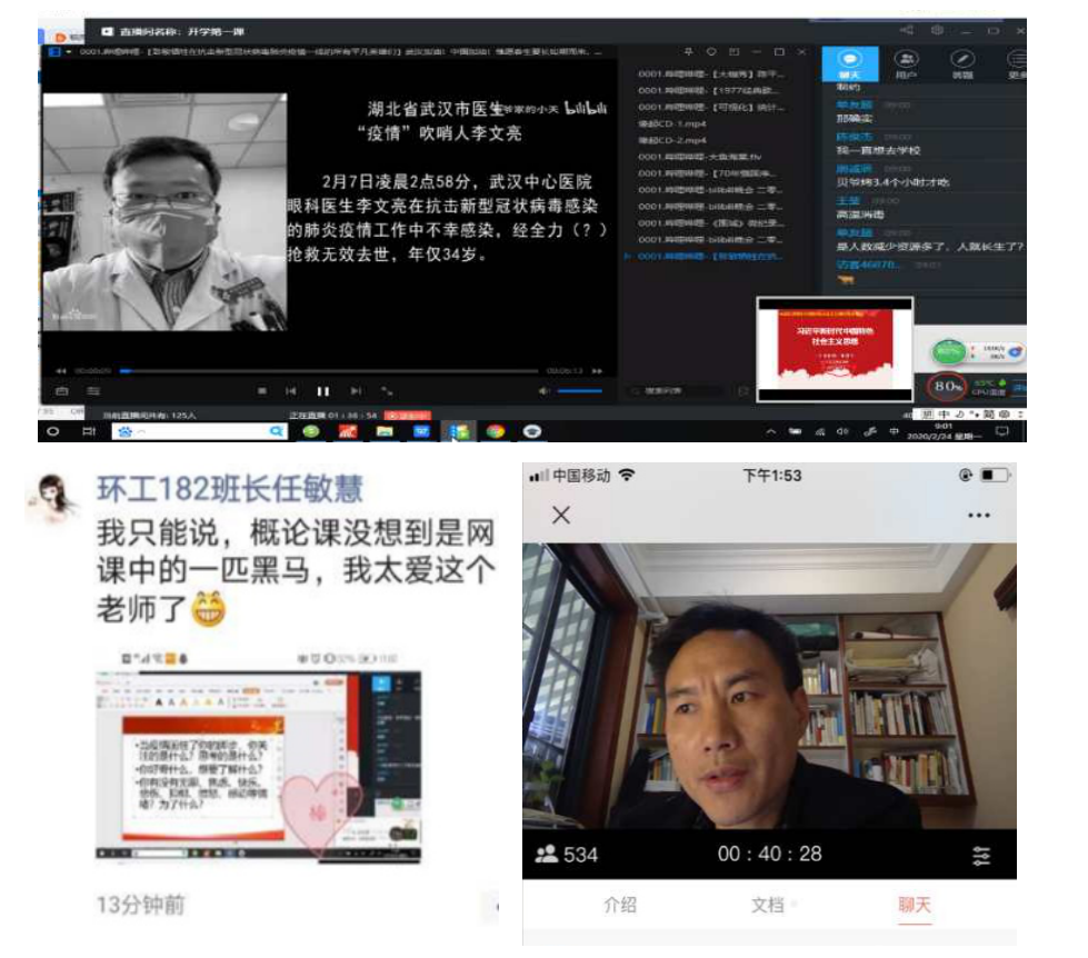 毛泽东思想和中国特色社会主义理论体系概论教研室以“宣讲党中央对人民生命健康权的保障,传递疫情防控中的体制优势”为教育主题方向,进行了多次网上专题备课会,研讨如何选择和操作平台,在所选择的平台上进行了直播和录播预演,对疫情专题的内容以及如何加强与员工线上互动进行了头脑风暴。“当疫情困住了你的脚步,你有没有无聊、焦虑、快乐、悲伤、抑郁、愤怒、感动等情绪?”对同学们情绪的关注,一下子拉近了第一次网上见面的师生关系。图片、音乐、视频丰富地展现了全国医护工作者“舍小家,为大家”的最美逆行。同学们感动着医务工作者的负重前行带来的后方平安。老师们则通过对疫情发展的过程梳理和习近平总书记关于疫情防控的讲话学习,启发同学去思考我国疫情防控体制机制、公共卫生应急管理体系等方面的体制优势和存在的短板。由于内容丰富,互动热烈,概论课的疫情防控专题教学获得了很好的授课效果,课时收看员工数远超上课员工数达6倍之多,得到了员工的充分肯定!
