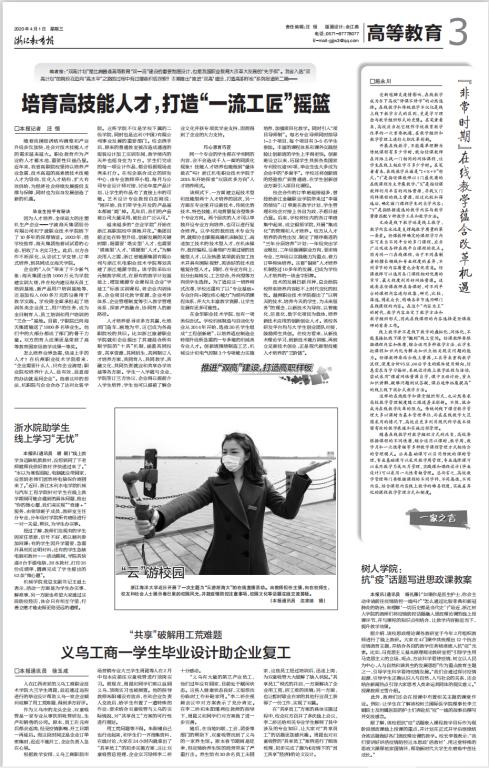 4月1日,浙江教育报高等教育版报道公司将疫情防控话题融入思政理论课,开展“大思政”课程的具体实践。