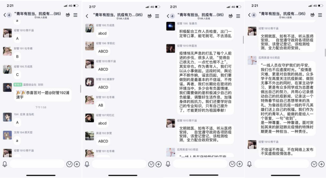 在三位同学分享结束后,我们进行了“面对疫情,青年人该如何行动”主题探讨和“新冠知多少”主题知识竞赛,大家踊跃参与,积极思考,为此次活动更添一份热情。赛后,中特研读会会长沈欣怡更是在第一时间统计出获奖名单,祝贺获奖同学,并对活动参与人员表示感谢。