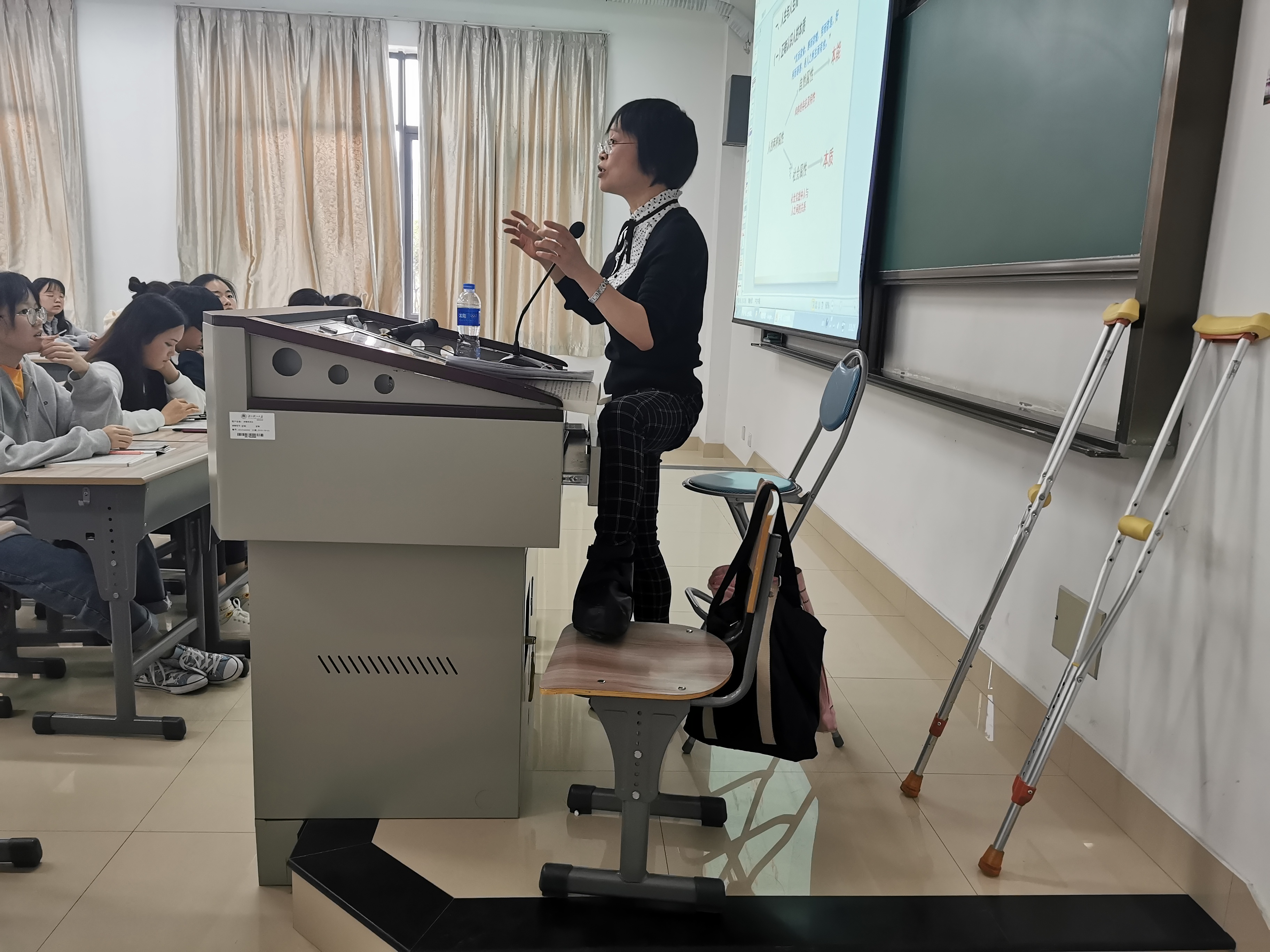 脚踩板凳,手指黑板,声音洪亮,神采飞扬……树大讲台上出现了一位“双面”老师。从正面看,她双眸有神,精神矍铄,这可能是位讲起课来声情并茂、激情澎湃的好老师;从侧面看,她左脚“霸气”地踩在凳子上,环视着整个教室,这大概是位“飞扬跋扈”、“仪态失度”的“坏”老师。细看才发现,一副拐杖正默默地斜靠在墙角,踩在板凳上的左脚用一块黑布包裹住了白色石膏,但仍能看出相对于右脚的肿大,这无疑是一位带伤上阵、爱岗敬业、诲人不倦的好园丁,这便是浙江树人大学yl永利集团官网登录的尹晓敏教授。