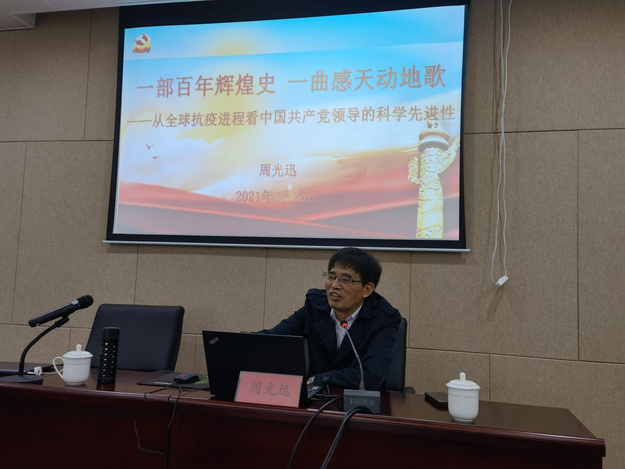 为进一步推动党史学习教育宣讲,4月25日下午周光迅经理应体美劳教育中心直属党支部的邀请,开展题为《“一部百年辉煌史 一曲感天动地歌”——从从全球抗疫进程看中国共产党领导的科学先进性》的讲座,从中国共产党百年辉煌史的简略回顾、抗疫进程中中国共产党展现出的科学先进性、抗疫进程中社会主义制度彰显出的巨大优越性、学党史、悟思想、办实事、开新局四方面入手,生动精彩的面向体美劳全体教师讲授了一堂极具思想性、指导性和针对性的党史学习教育专题党课。
