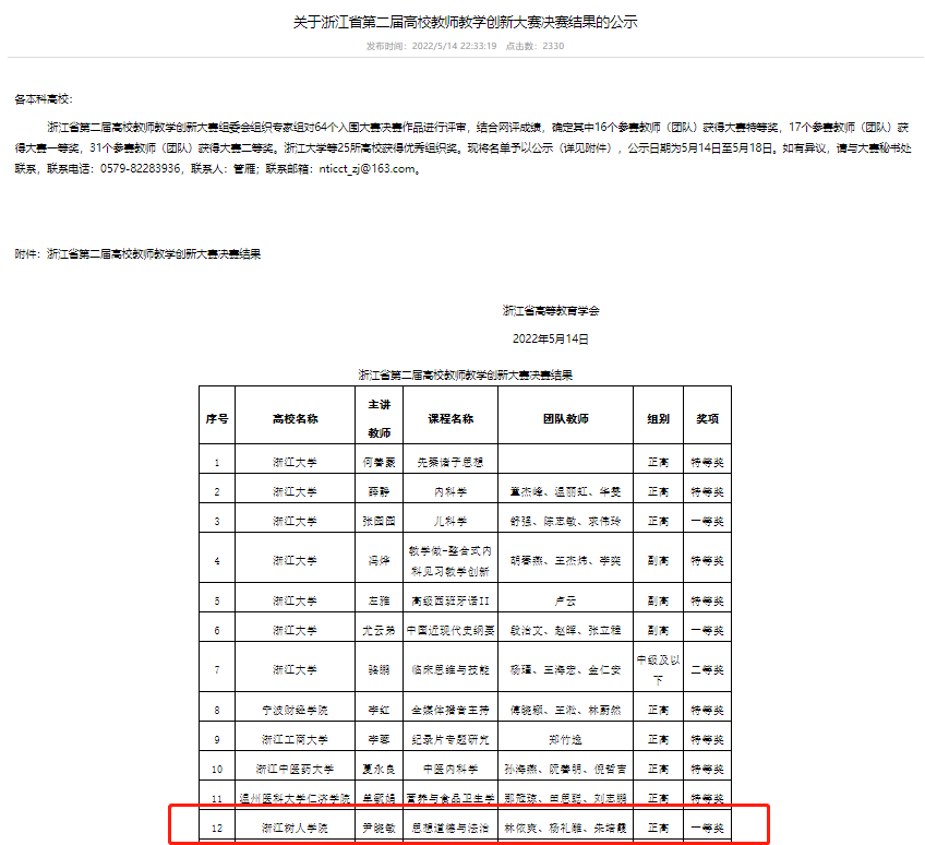 近日,由浙江省教育厅指导,浙江省高等教育学会主办,浙江师范大学承办的浙江省第二届高校教师教学创新大赛公布了评审结果,公司尹晓敏教授团队《思想道德与法治》课程荣获教授组一等奖,展现了yl永利集团官网登录不断加强课程创新建设的工作成效。