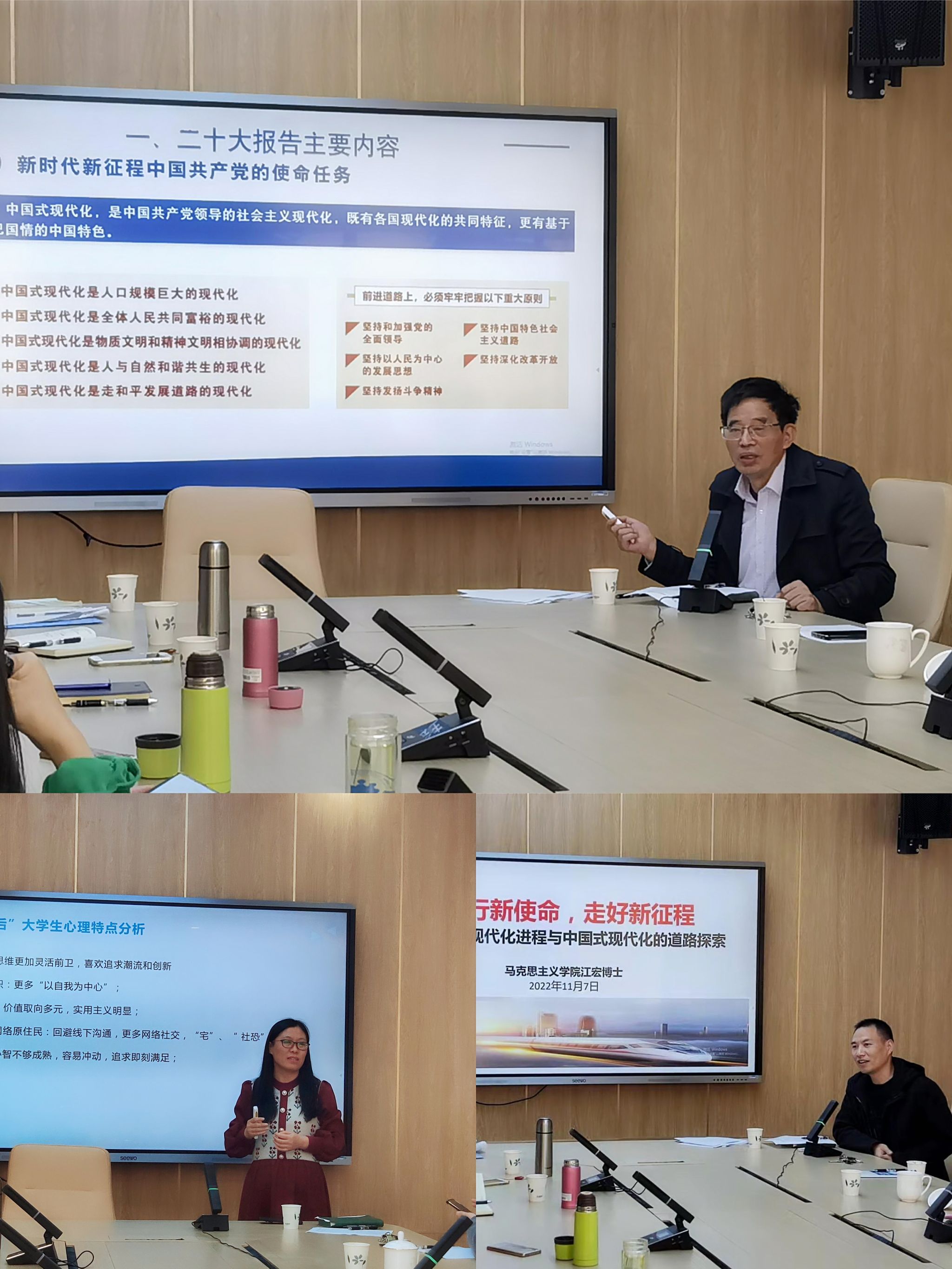 江宏博士分享了其题为《履行新使命,走好新征程——世界现代化进程与中国式现代化的道路探索》的二十大报告精神学习宣讲主旨内容,他指出:全面建设社会主义现代化国家是一项伟大而艰巨的事业,前途光明,任重道远。我们必须增强忧患意识,坚持底线思维,做到居安思危、未雨绸缪,准备经受风高浪急甚至惊涛骇浪的重大时代考验。