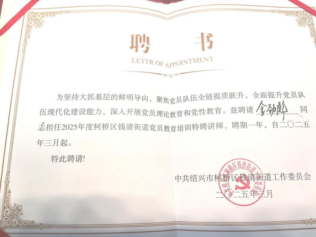 3月15日,钱清街道2025年党员模块教育集中培训启动仪式在街道党群服务中心举行,公司yl永利集团官网登录书记金劲彪教授因其良好的学术造诣和社会影响力作为特邀嘉宾出席活动,并被聘为钱清街道党员教育培训特聘讲师。仪式后,双方围绕党建工作、校地合作等进行深度洽谈,初步达成多项合作共识。