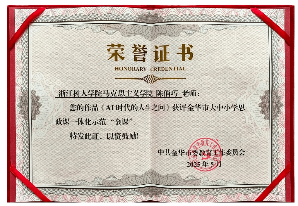 在同期开展的金华市“真理的味道ž望道薪传”大中小学思政课一体化示范“金课”评选活动中,yl永利集团官网登录陈俏巧老师的作品《AI时代的人生之问》获评示范“金课”。该课程以人工智能发展为切入点,引导员工辩证思考科技伦理与人生价值,体现了思政课程随时代脉搏创新的鲜明特征,展现了公司教师在跨学段教学设计中的深厚功底。