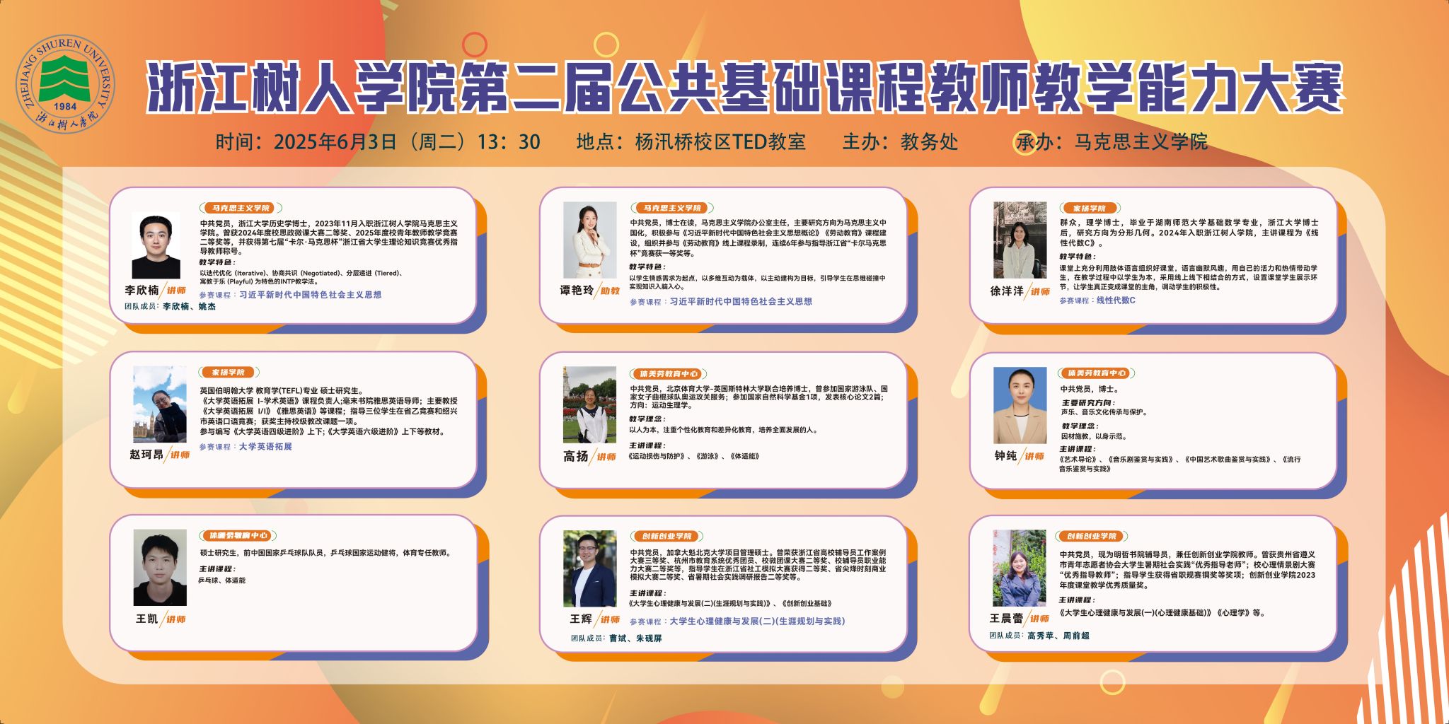 根据《关于举办永利集团官网第二届公共基础课程教师教学能力大赛的通知》工作安排,各公共教学单位完成了遴选推荐,共有9位教师进入决赛。经研究,定于2025年6月3日(周二)下午在杨汛桥校区TED教室举行决赛,欢迎广大师生前往观摩。